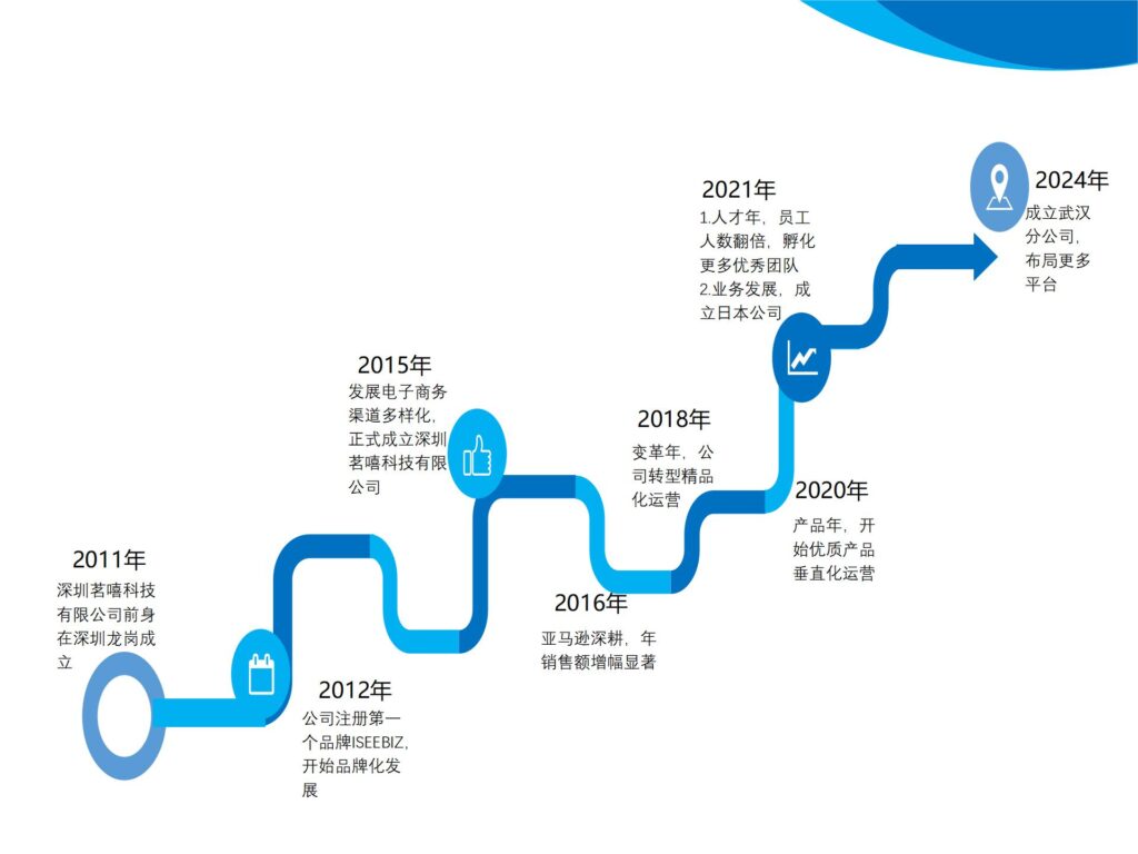 2011年 茗嘻科技前身成立2012年 注册第一个品牌ISEEBIZ2015年 成立深圳茗嘻科技有限公司, 渠道多样 化运营2016年 销售额增长年,深耕亚马逊平台2018年 变革年,转型精品运营2020年 产品年,优质产品,垂直运营2021年 人才年,员工翻倍,孵化更多优秀团队 业务发展,成立日本公司2024年 拓展年,成立武汉分公司,布局更多平台···